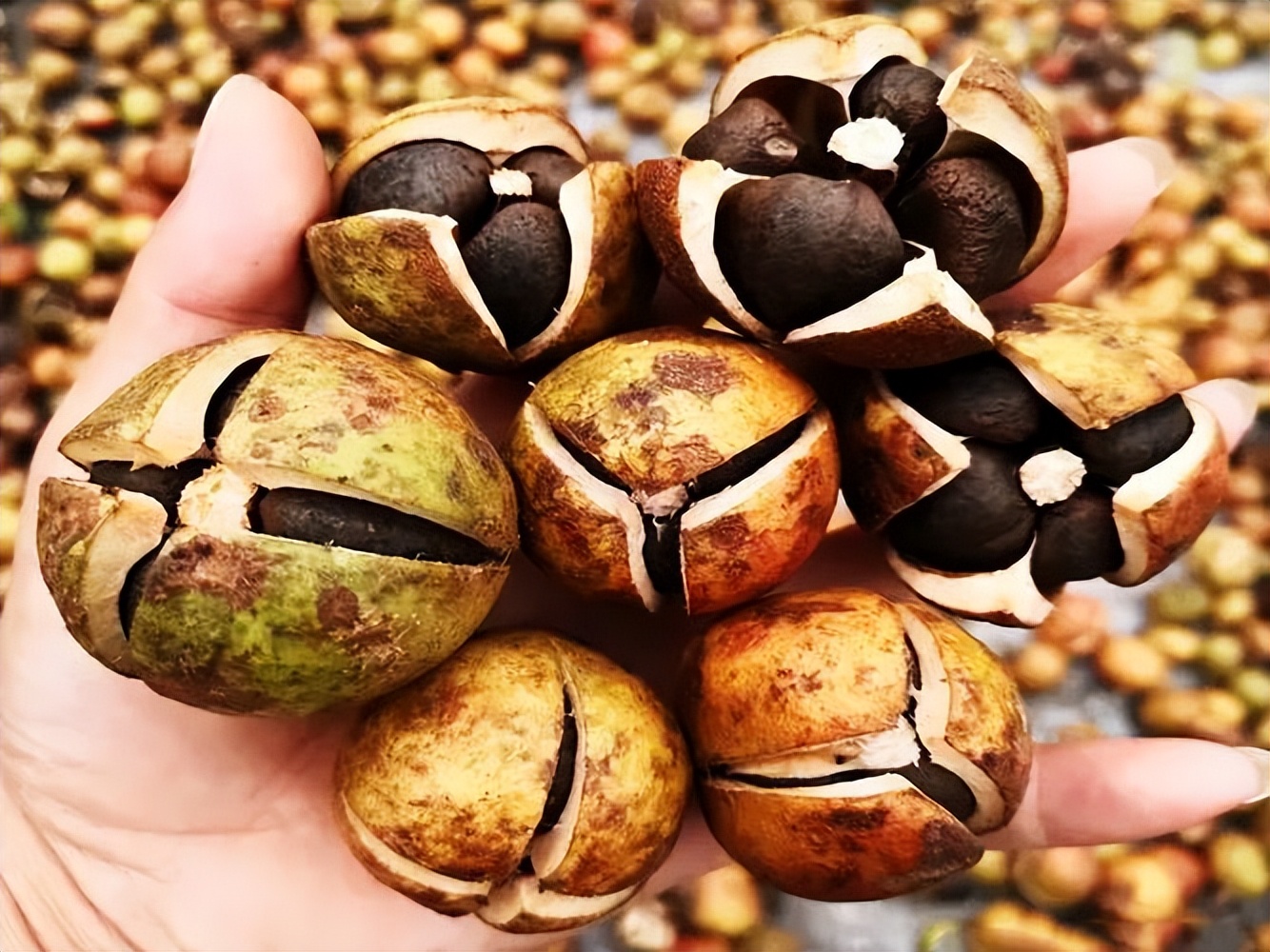 這個時候,就要采摘回去了,把它放在太陽下面一曬,讓口子開大一點,把里面的種仁弄出來。