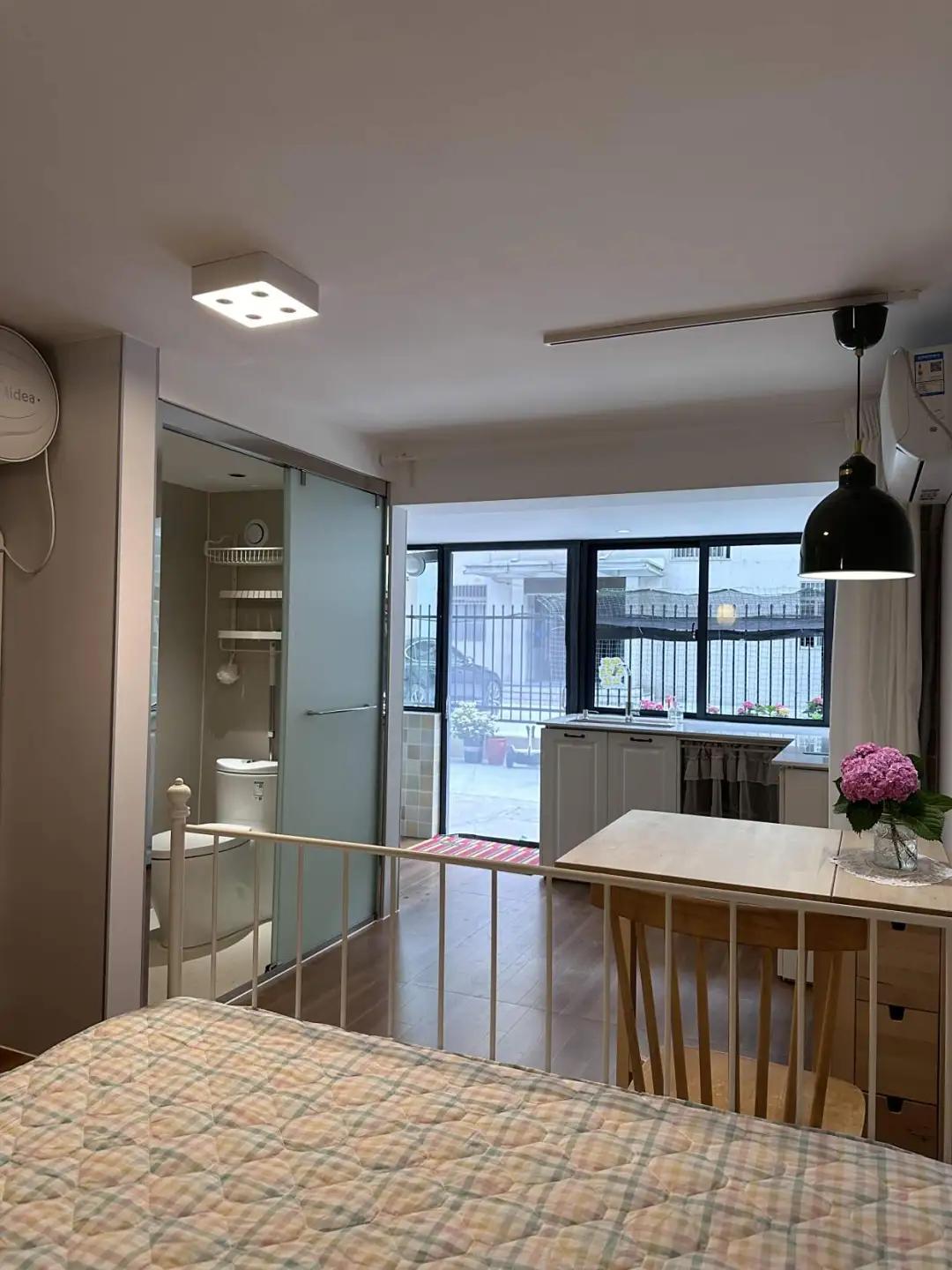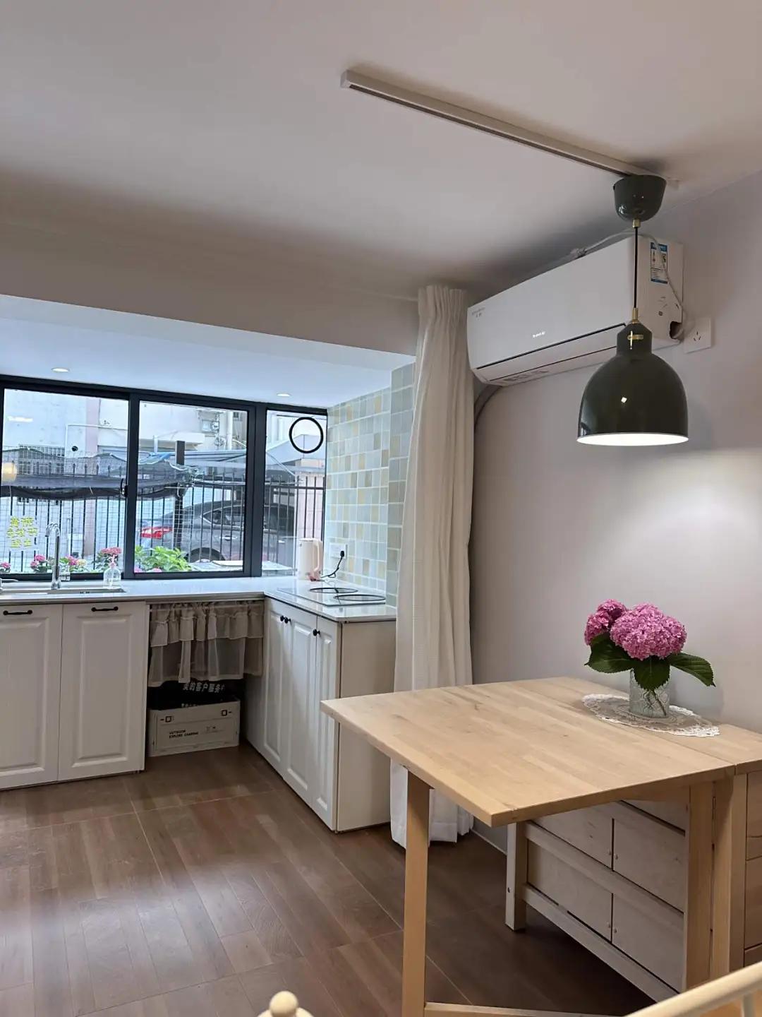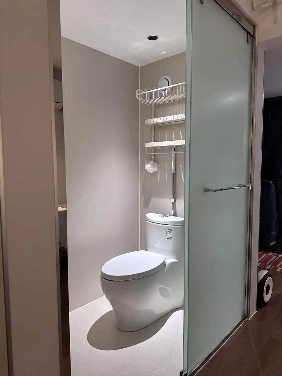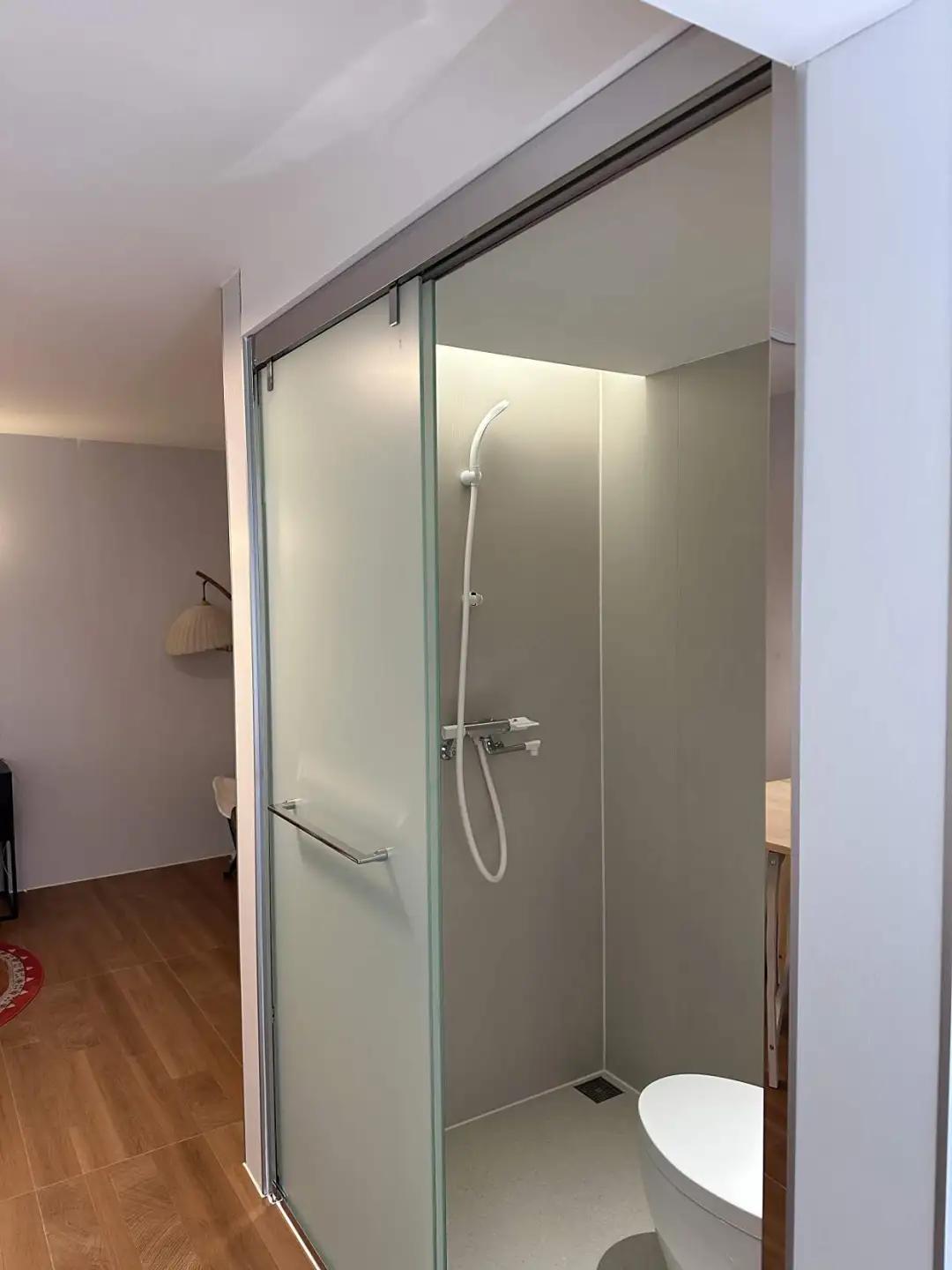 廁所位置裝的是折疊的浴簾,洗澡時圍合,不用時拉開,還能讓水汽快速排出,適合日常生活的裝修方案!