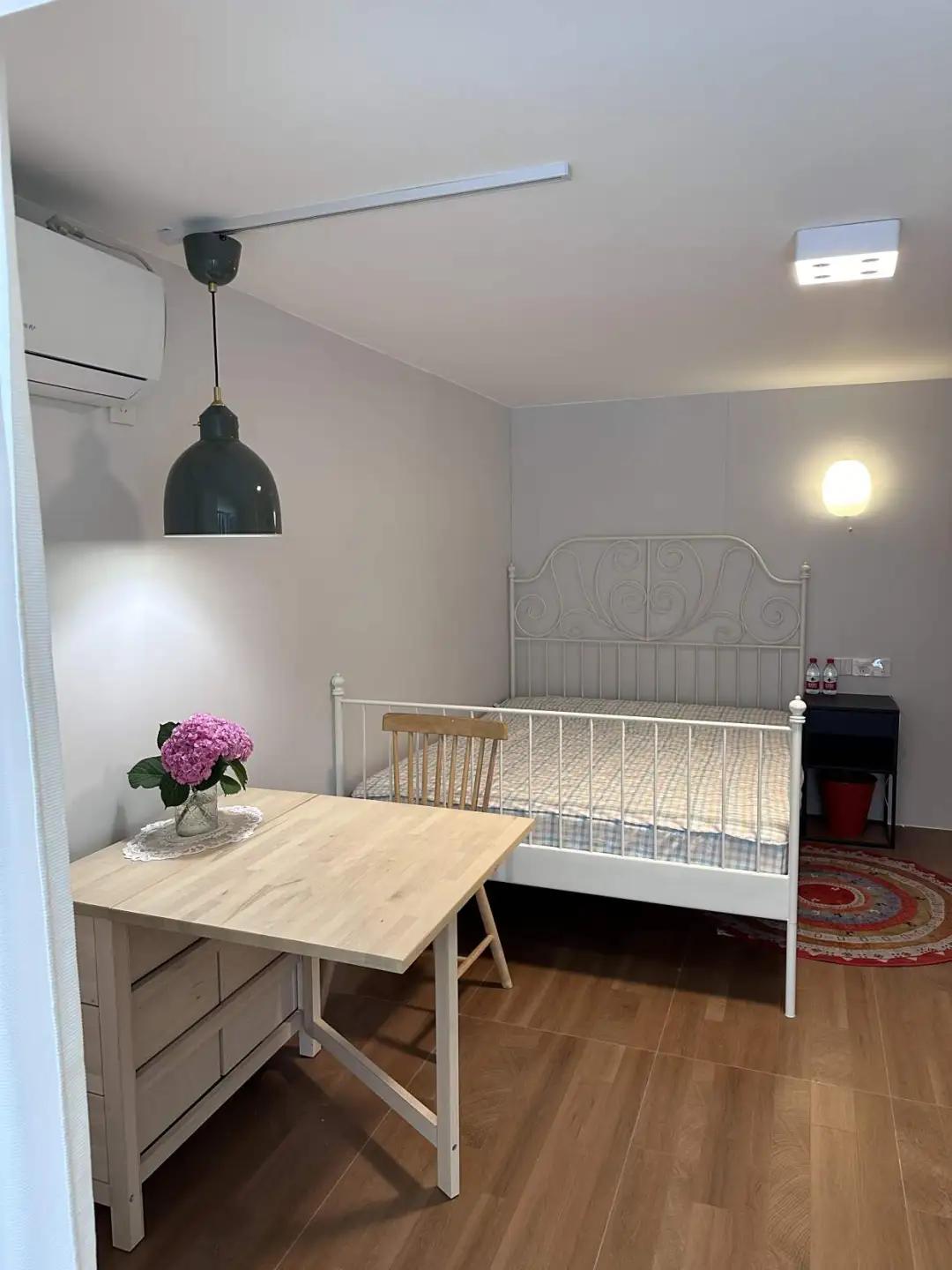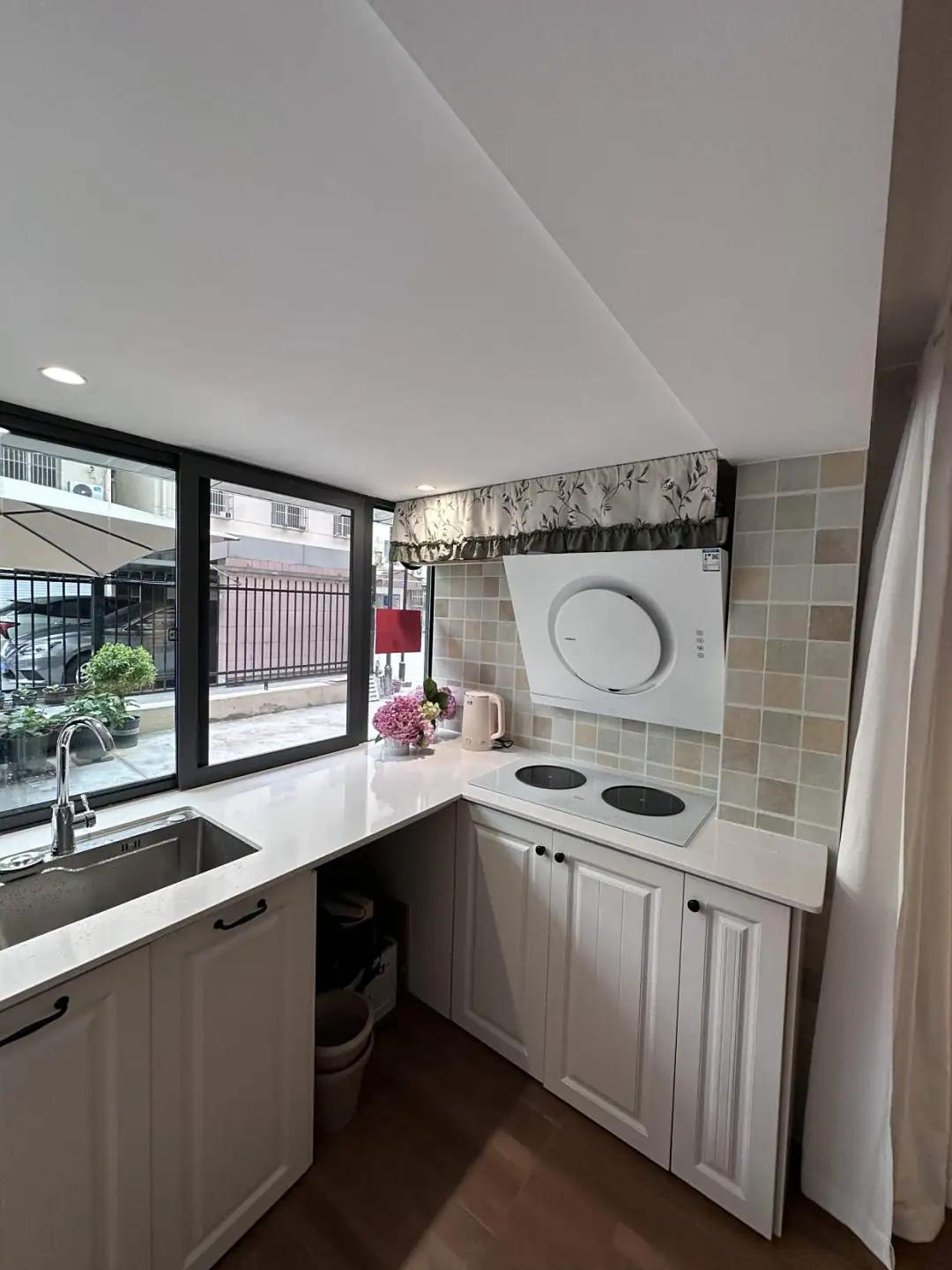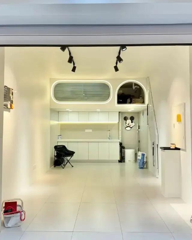 因車庫的原始層高很高,所以就做了閣層設計,在上面加了一層,做成了臥室,下層的空間做了一趟柜子,既可以當櫥柜,還可以當餐邊柜,超級方便。