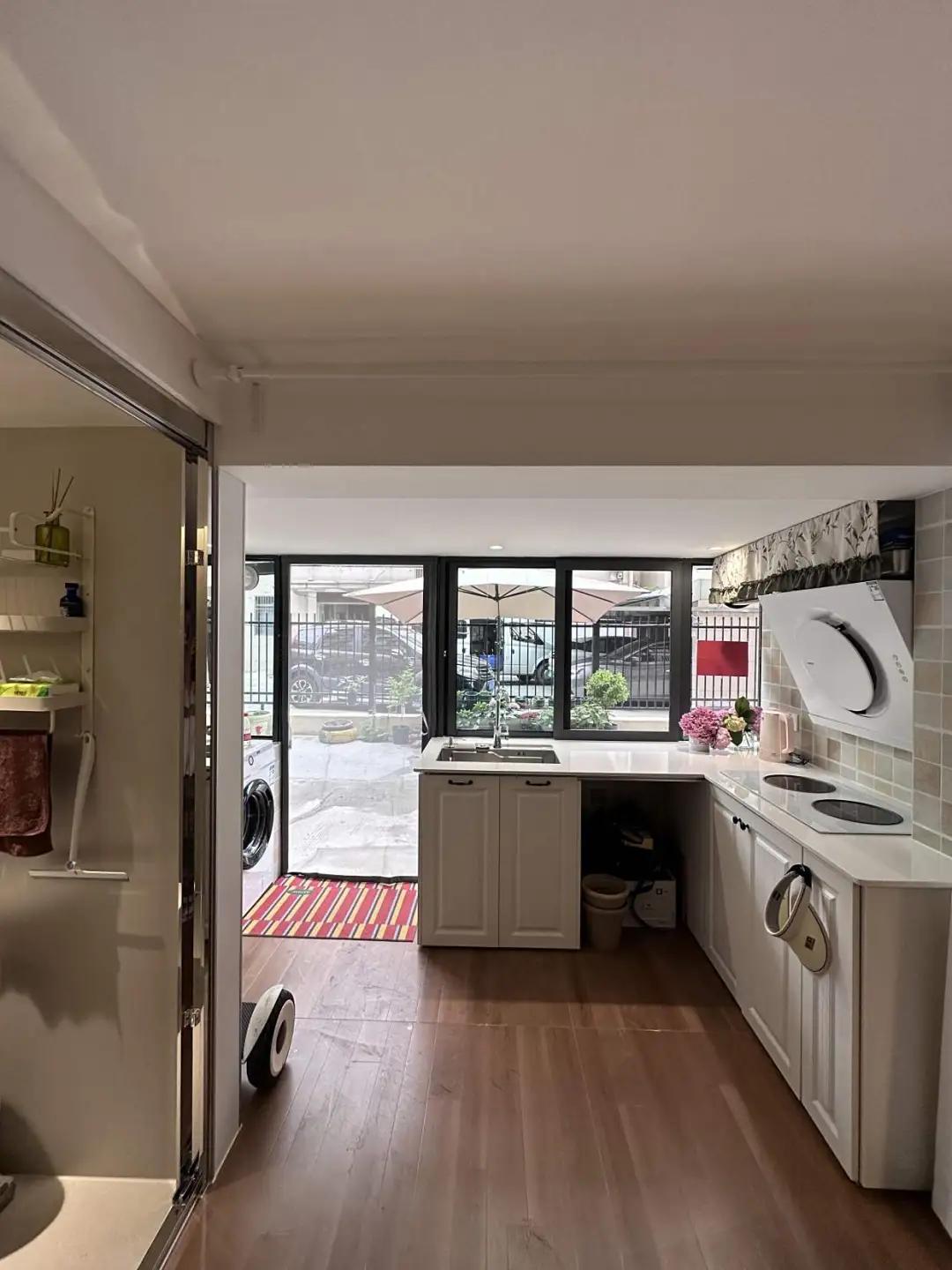 在門口窗戶邊做的衛生間,衛生間做成了明廁,方便水汽散發,車庫不會有潮濕感,人住的也是非常的舒適!