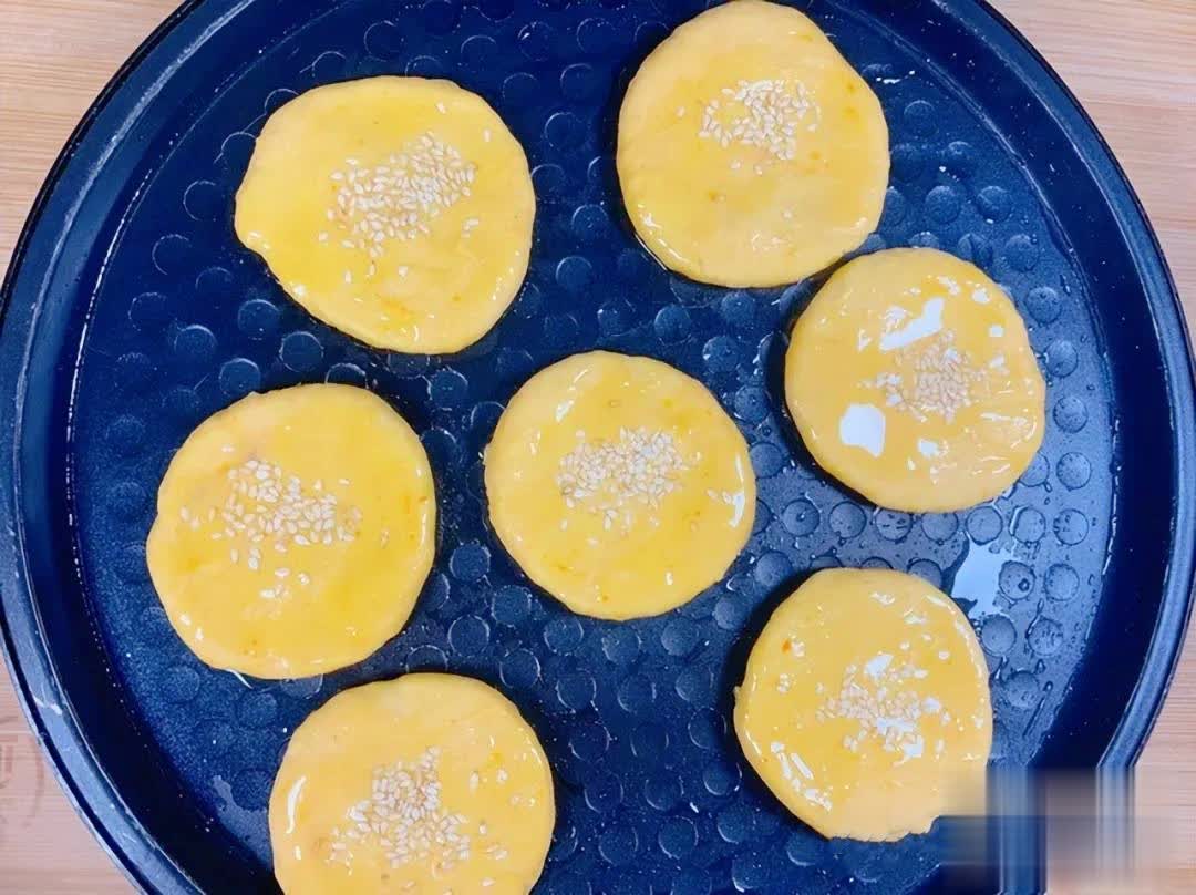 半個(gè)小時(shí)后,將面團(tuán)分成幾個(gè)小劑子,逐個(gè)按成圓餅狀,然后在表面撒上白芝麻。電餅鐺預(yù)熱后刷上一層薄薄的食用油,小餅整齊地?cái)[進(jìn)去,不過(guò)幾分鐘,一面就烙成了金黃色。翻面再烙一會(huì)兒,待兩面都金黃誘人時(shí),柿子小餅就做好了。婆婆鏟出一個(gè)遞給我:“小心燙,慢慢吃。”