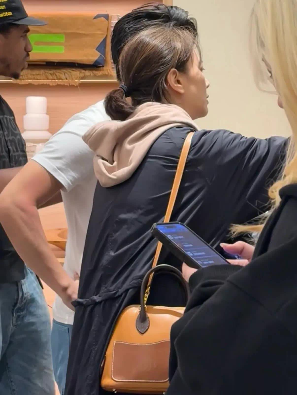 袁詠儀正在認真挑選東西,而她身邊還站著一個黑色頭發、穿白色t恤和藍色牛仔褲的帥哥,少年感十足,很像張智霖,盡管沒有看到臉,但從身材一看就能認出是兒子魔童,跟他的近照特別像。