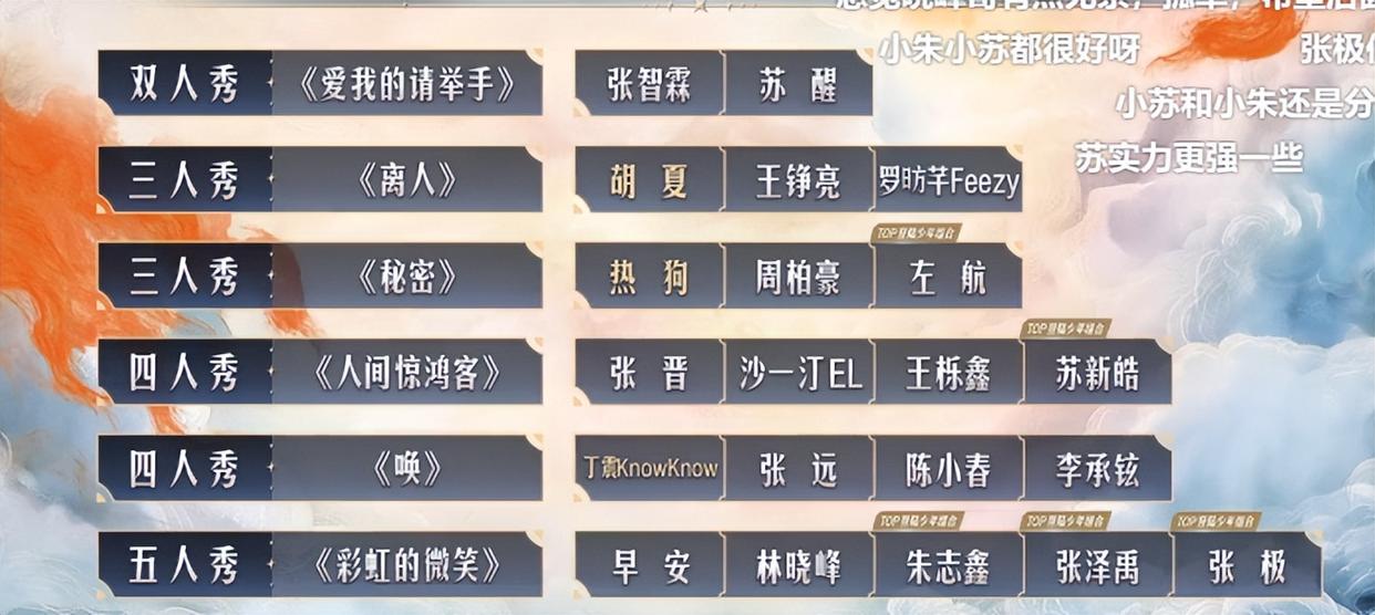通過第四輪舞臺(tái)公演的規(guī)則,我們可以發(fā)現(xiàn),這個(gè)規(guī)則對(duì)TOP登陸少年是非常有利的,因?yàn)樗麄児灿形鍌€(gè)人,分散在三首歌曲中,最關(guān)鍵的是,《人間驚鴻客》《彩虹的微笑》《秘密》都是排名較高的舞臺(tái),這樣的情況出現(xiàn),他們的平均分肯定會(huì)非常高。