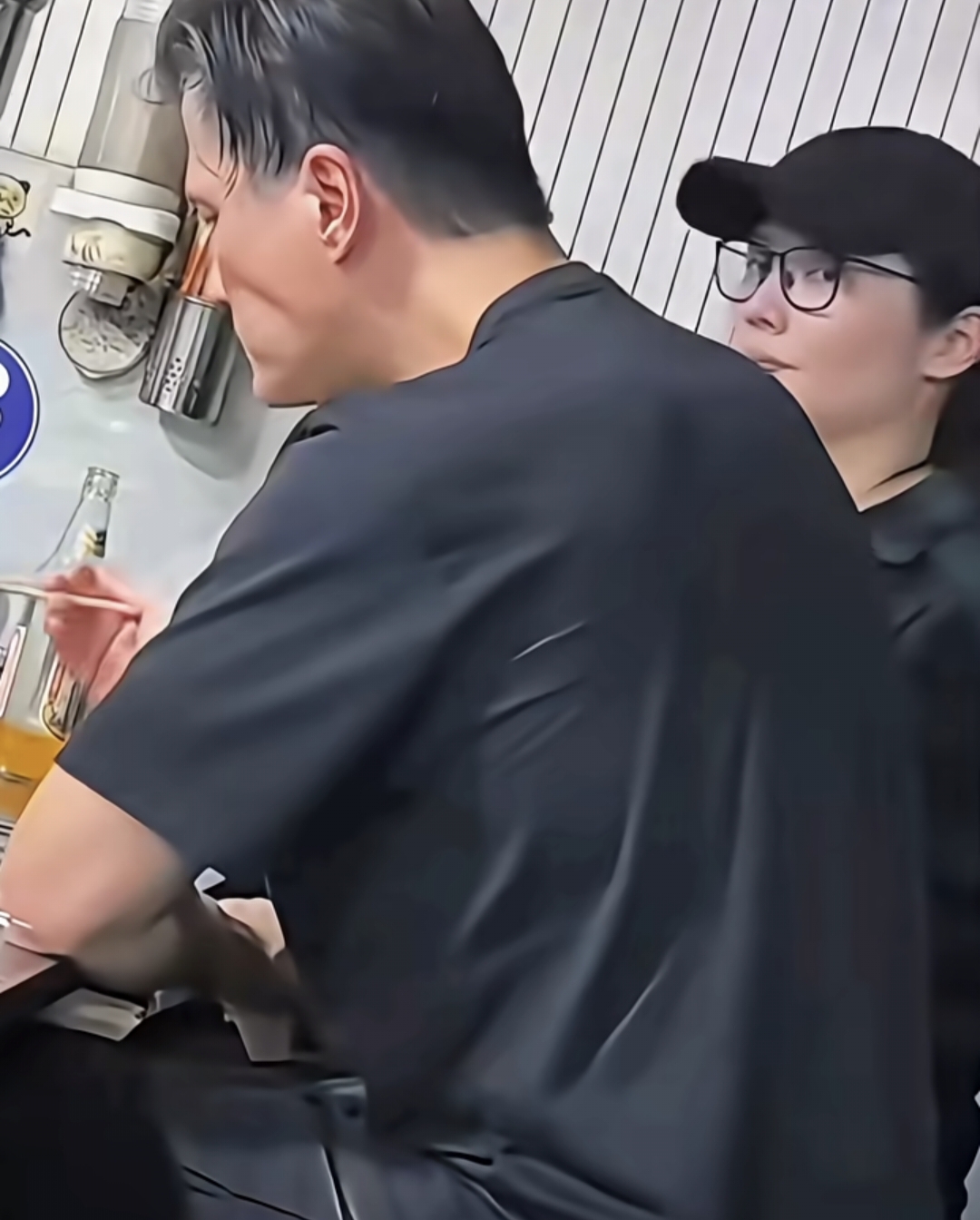 尹子維穿著一身黑色衣服,穿衣打扮非常酷,本來他穿著外套,因為太熱了,進到店里之后就把外套脫了,上半身只穿了一件短袖T恤。