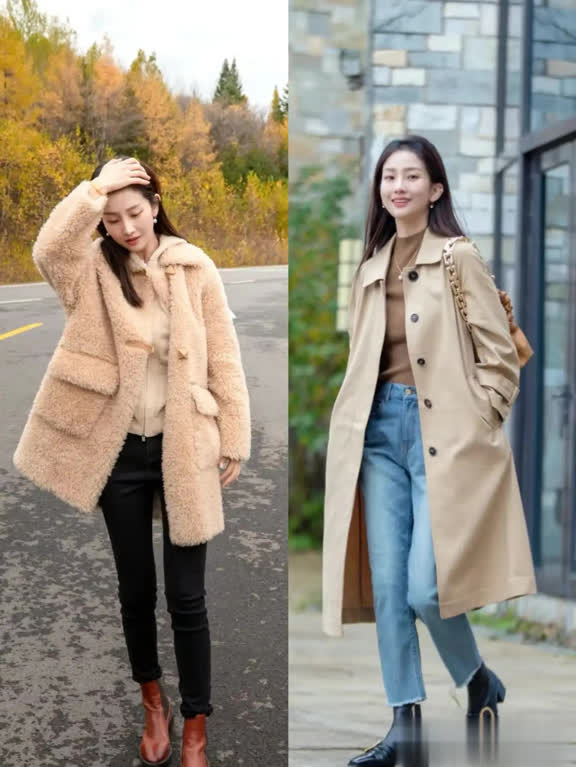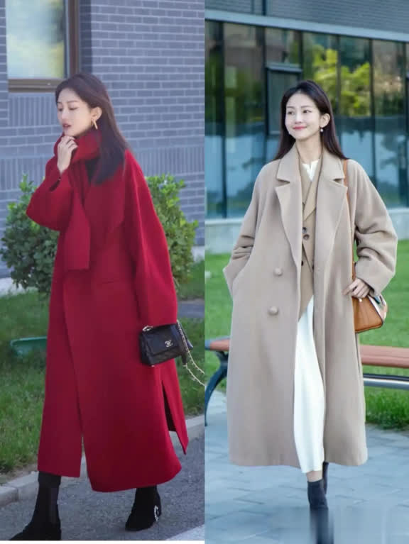 具體穿衣的時候,我們可以來看看這種廓形大衣的搭配,冬天的時候,一件卡其色或者是紅色大衣穿上身都能夠展現出濃濃的女人味,氛圍感超強。