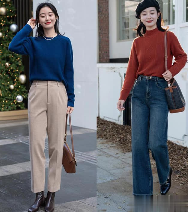 針織衫和直筒褲的搭配簡單又實用,沒什么搭配思路的時候,你就完全可以來照搬這樣的搭配,一定不會有問題。就像這種短款的毛衣和高腰褲銜接,也打造出了三七分身材,簡直太增高了。