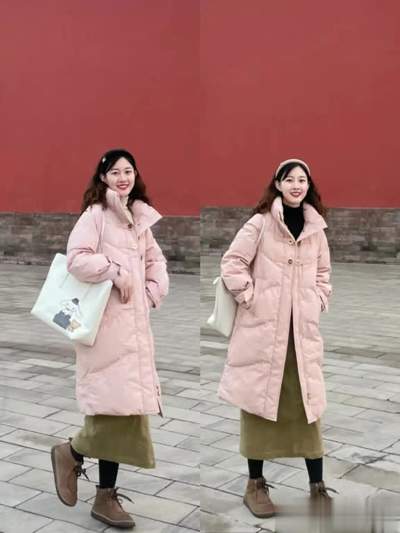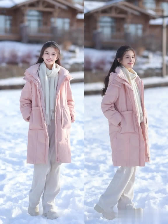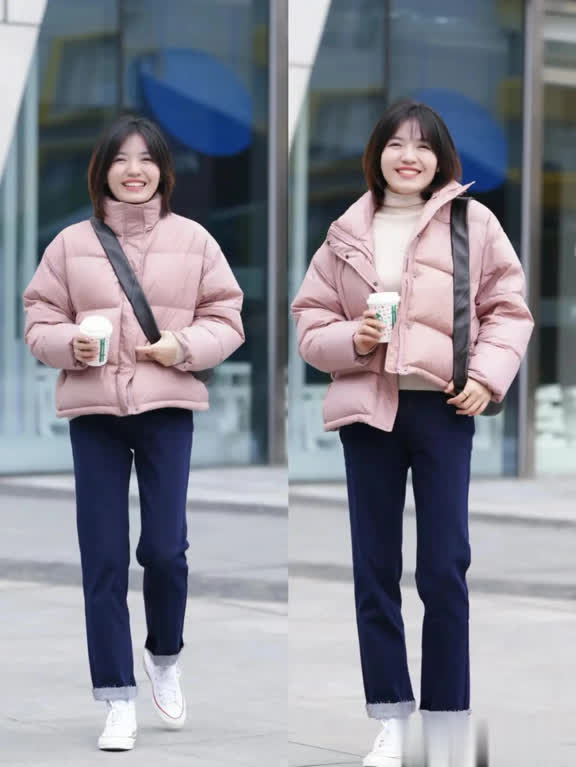 粉色羽絨服具有一定的減齡效果,如果你不想搭配的太幼稚,你可以在下半身去搭配一些基礎款。