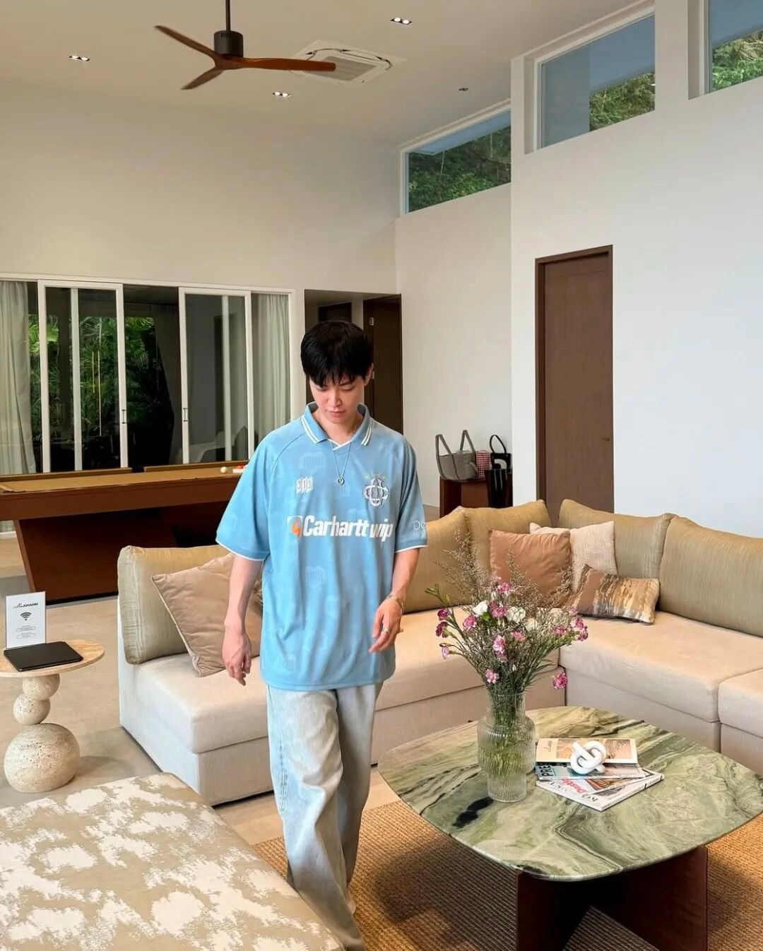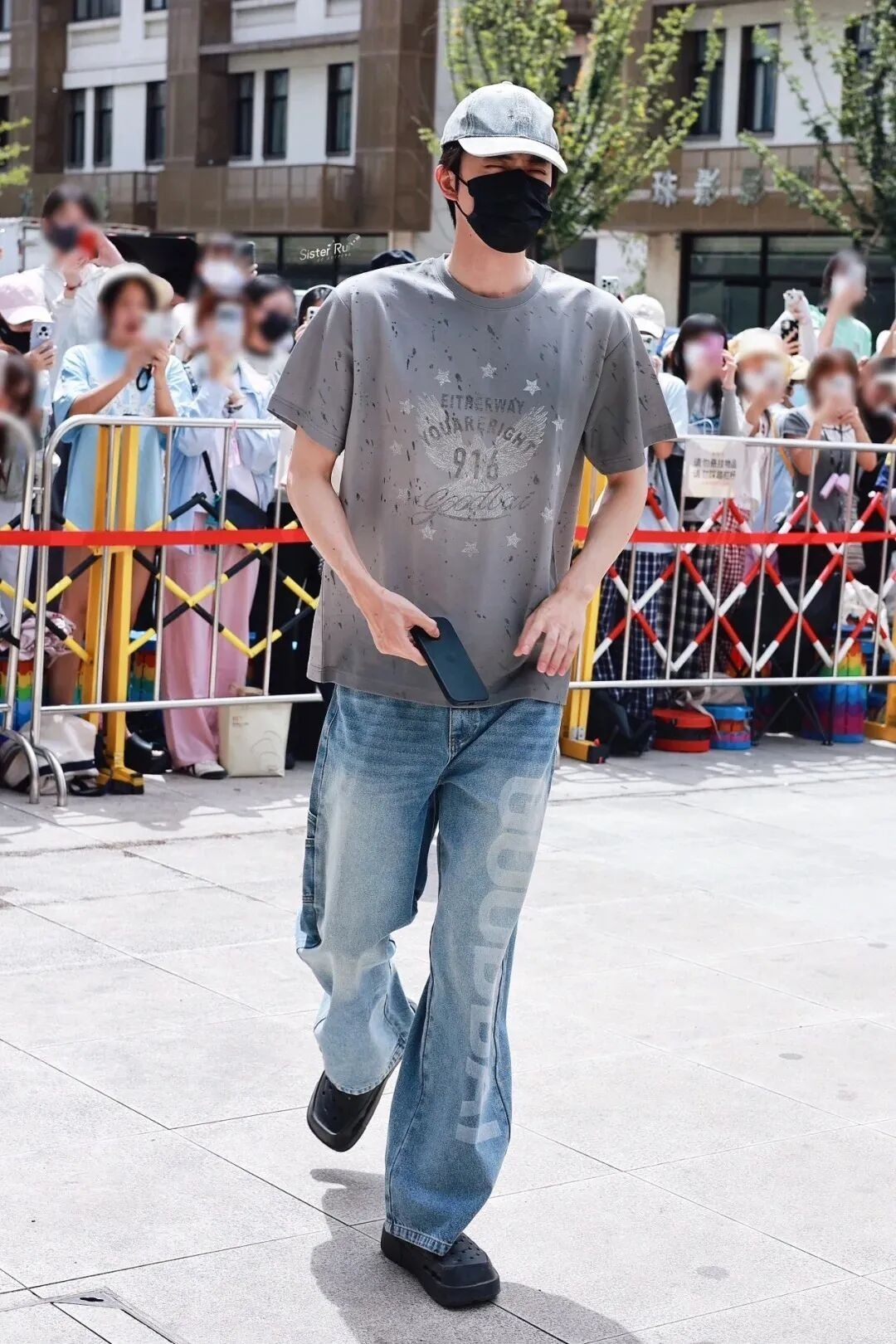 藍色短袖其實大家穿挺多的,像他這件是比較玩趣的,走在人群中很有意思。搭配上他是用簡單的牛仔褲來穿,像這樣一個單品復雜,一個簡單就達到了非常高的境界,也能讓你看上去特別帥氣。