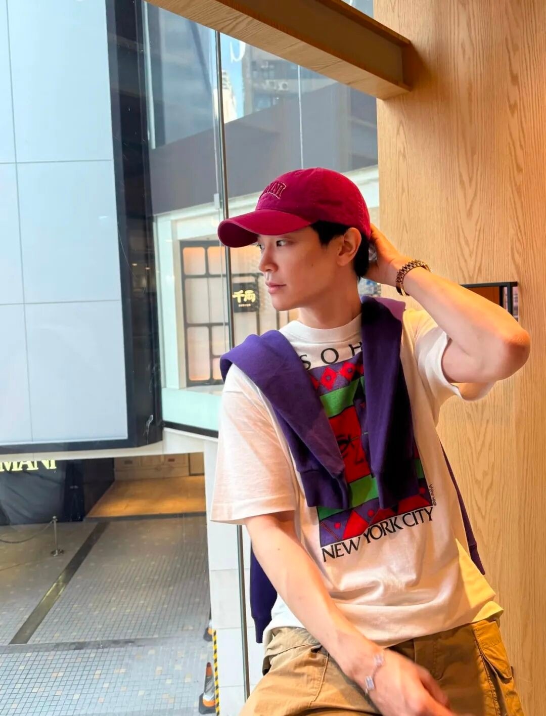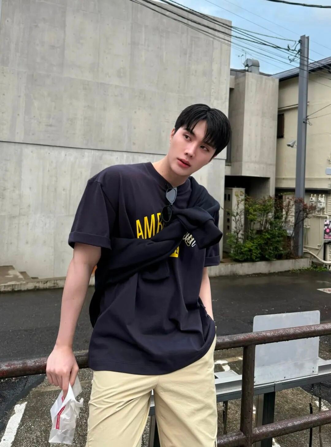如果你整個人是偏溫文儒雅型的男生,可以學學他的做法,把自己打造成更為休閑感的樣子。只不過是用了灰色短袖搭配卡其色褲子和德訓鞋,就達到了這樣的效果。