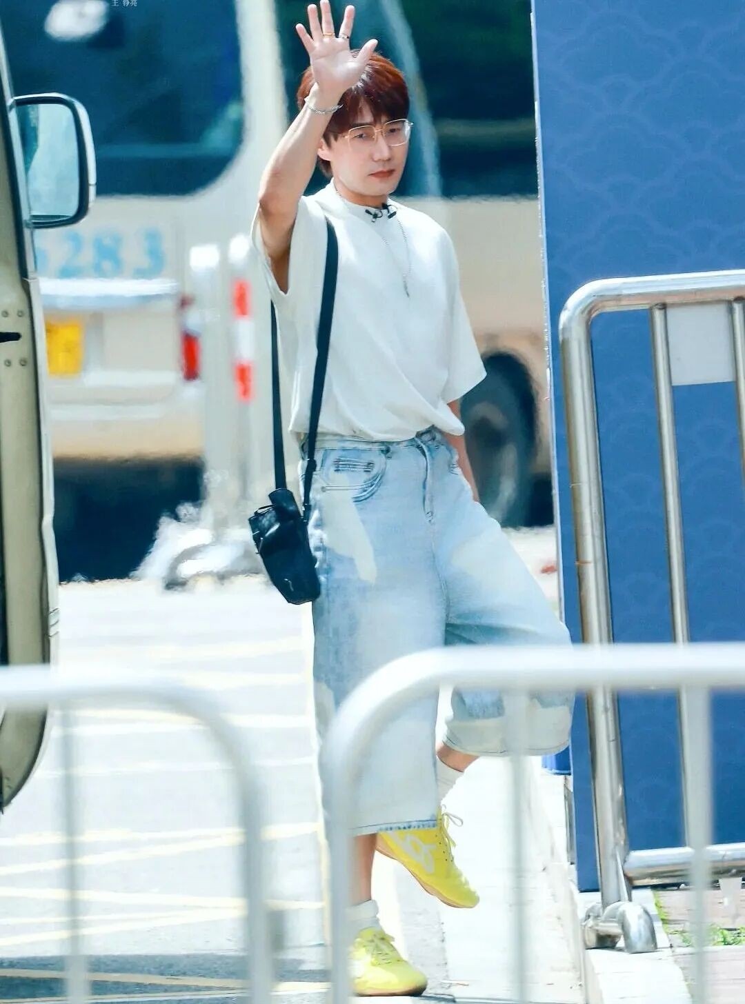 牛仔褲的話其實像他這樣穿八分的,反倒會暴露腿型的缺點。要么就選五分褲,要么選完全的長褲,才是更保險的做法,而且在搭配上更易好看,也不會讓你的個子被截斷開來。