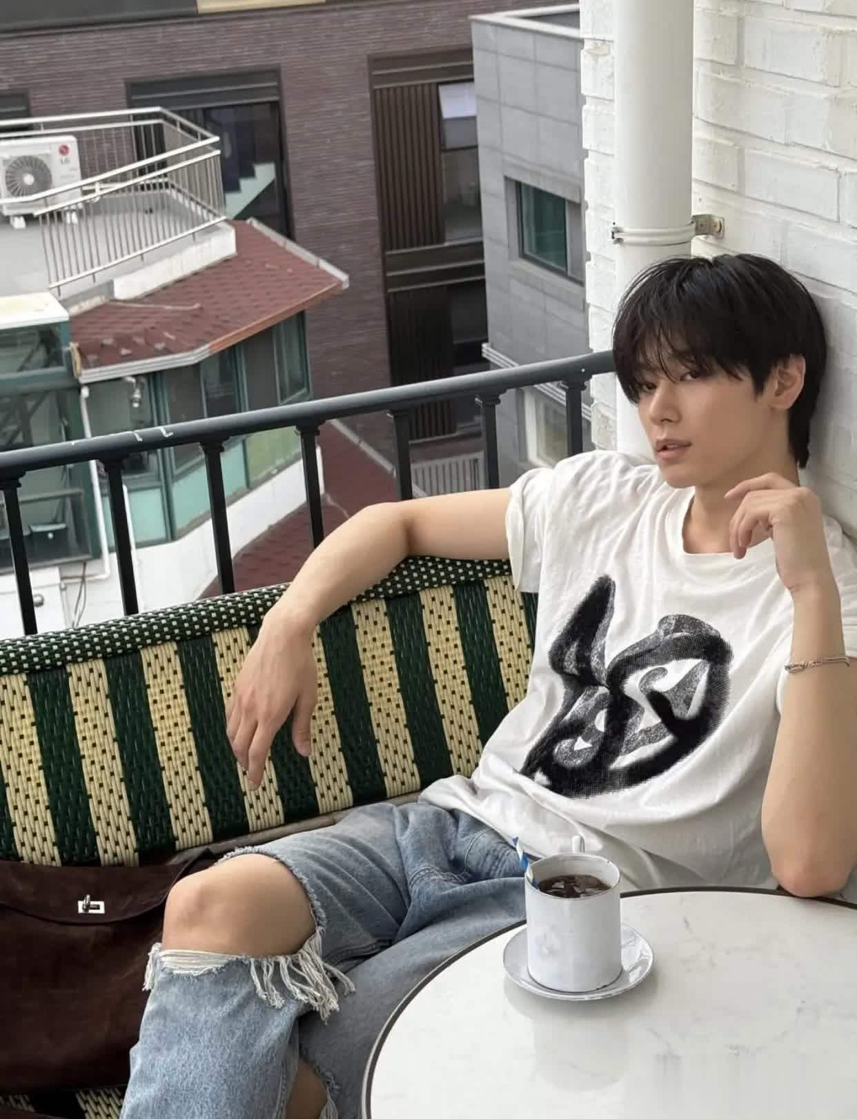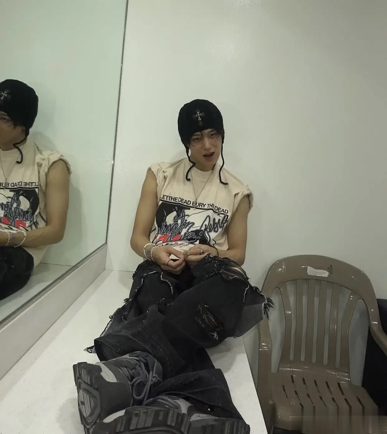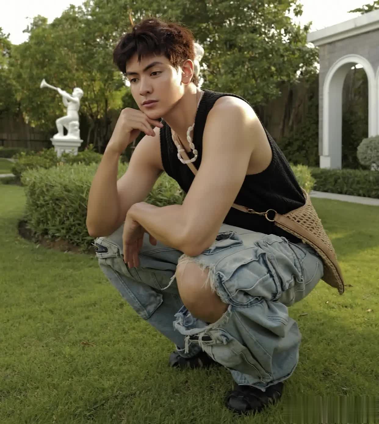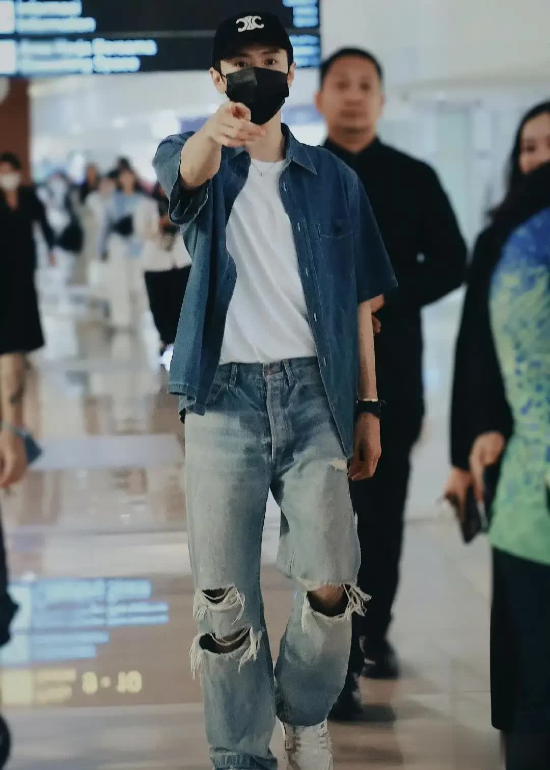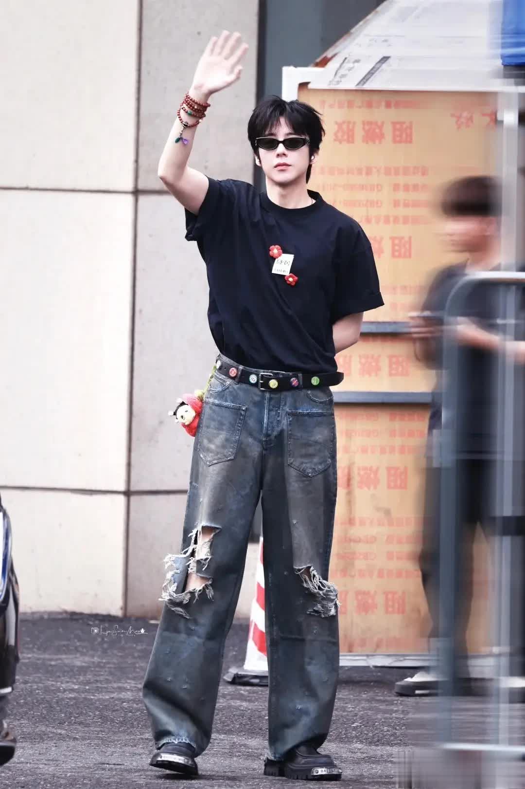 劉宇寧的這條破洞牛仔褲也特別有意思,其實它的洞口是不對稱的,用來搭配黑色短袖就顯得他整個人非常的有破碎感。比起基礎款的牛仔褲來說,它要更顯個性一些。而且他在皮帶上下了點功夫,用的是有設計感的皮帶,整個人的風格瞬間就變得耳目一新。