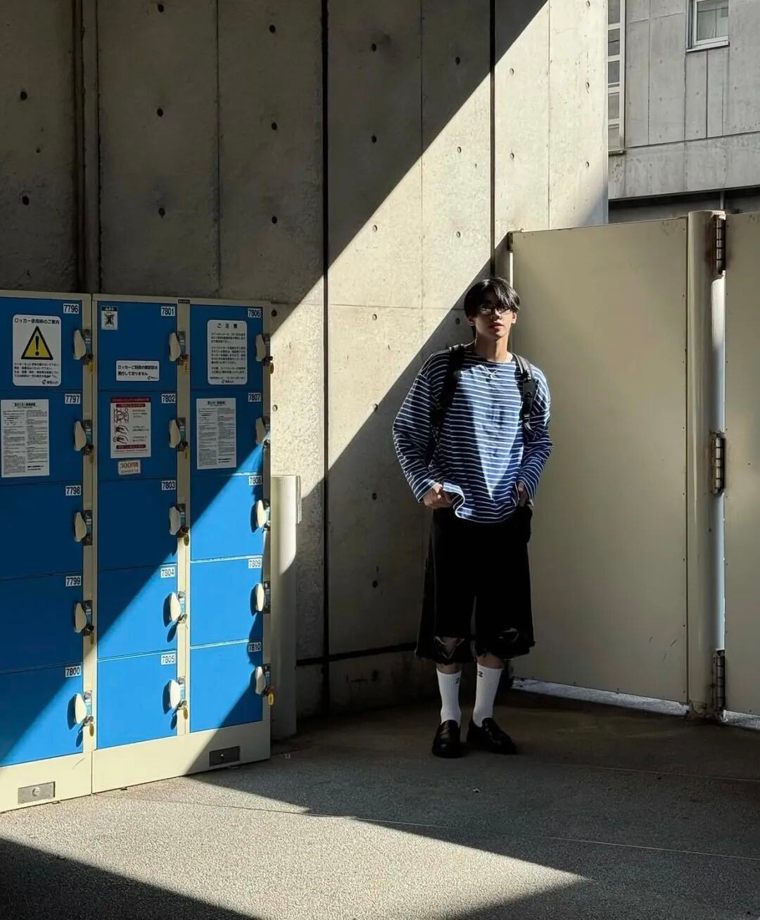 藍色條紋衫容易一不小心就穿得很無聊,就可以像他這樣穿一條破洞牛仔中褲,很有時髦感,而且走在人群中也是能讓大家眼前一亮的存在。