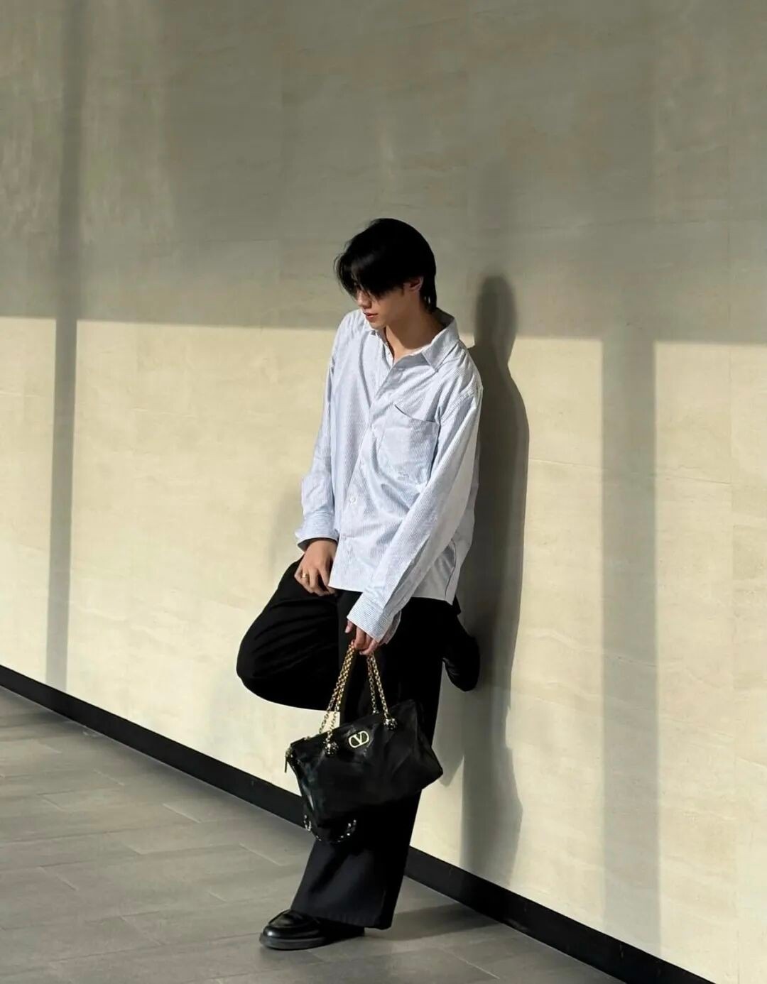這身則是在包包上做了文章,往往在穿基礎款的時候,更要額外在配飾上做加法。他在鞋子上還蠻有自己的看法的,選了一雙看上去沒那么單調的鞋子,很能增加全身的看點。