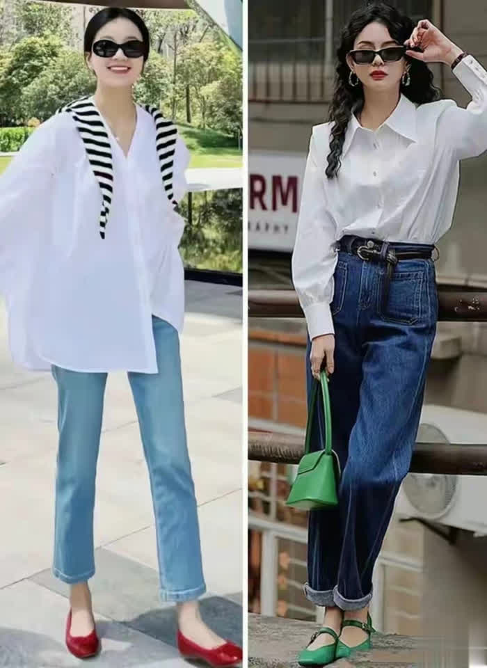 其實比較推薦大家選擇白色的襯衫,原因很簡單,白色的襯衫比較百搭耐看,不管你是選擇搭配什么樣的褲子都可以,例如下面選一條牛仔直筒小腳褲和一條藍色的牛仔煙管褲,腳上用一雙紅色和綠色的瑪麗珍鞋搭配,輕松穿出通勤時尚的造型。