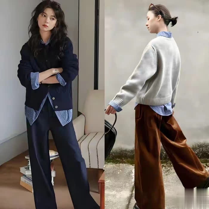 00后的美少女,想讓自己的穿衣打扮比較個性,有時候咱們可以選擇一件格紋的襯衫作為內搭,能達到一個點綴的效果,外套的話用藏藍色的針織開衫或者是灰色的針織開衫來搭配就夠,下半身的褲子直接選擇闊腿褲,絨褲來搭,輕松穿出少女感。