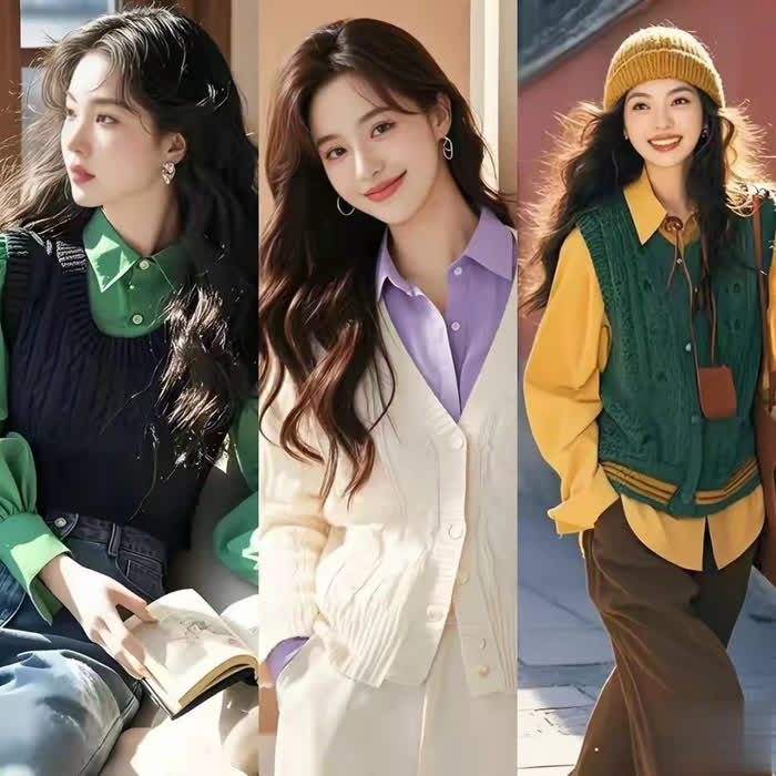 想要更個性可以在襯衫的顏色上下點功夫,比如下面用綠色襯衫,紫色襯衫,還有黃色襯衫作為內搭,是不是和針織開衫,還有褲子形成一個撞色的效果?你的造型層次感變得更加分明時尚。