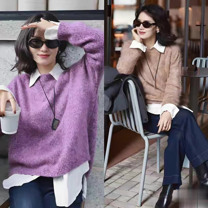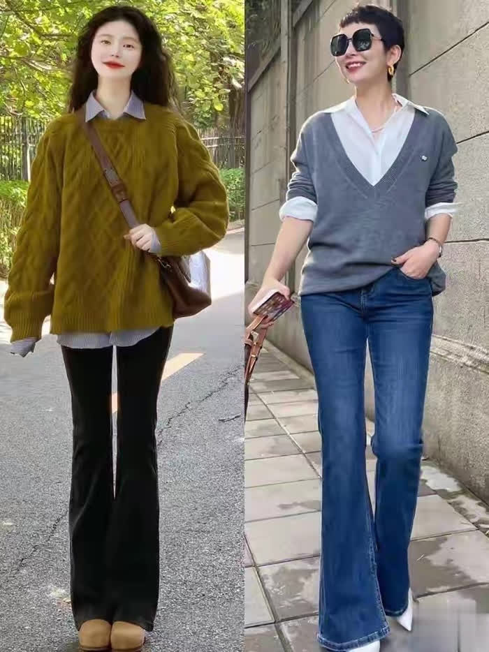 疊穿技巧不分年齡,就算是四五十歲的中年女性,選擇一件大V領的灰色針織上衣疊加白色襯衫和一條藍色的牛仔微喇叭褲,腳上穿了一雙白色的尖頭高跟單鞋,給人的感覺也是顯得非常的時尚,所以說襯衫不光可以單穿,用疊穿也是很不錯的。