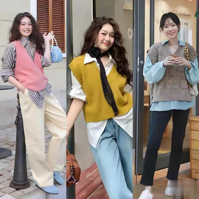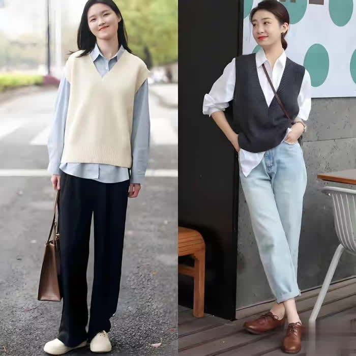 想要自己的打扮,簡簡單單也可以,比如下面用V領的針織背心搭配上牛仔褲,內搭一件白色襯衫 ,這樣的搭配采用了松緊結合的穿搭造型,而且大V領的針織背心還能延伸你的頸部線條,所以說想要變得更精致,細節處理要好才行。