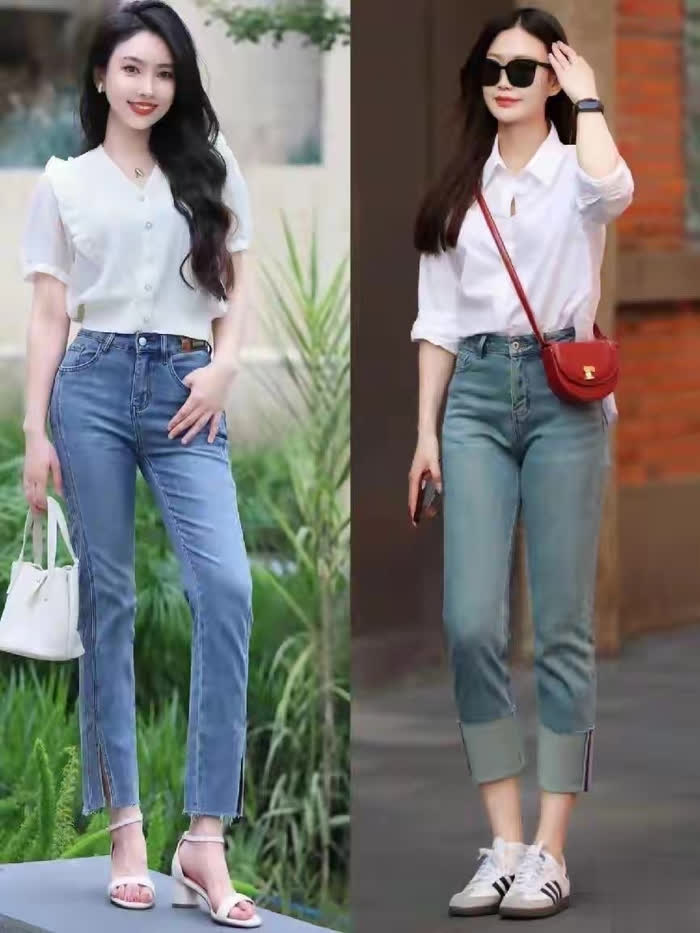 有的時候擔心自己的褲子穿在身上容易壓身高,那么直接選擇下面這種牛仔9分褲最為合適,如果你的褲腳比較長,可以把褲腳挽起來,也能很好的形成一個9分褲的版型,露出你的腳踝,這樣能延伸你的腿部線條,看起來確實會更加的干練清爽,再搭配上一件白色的小絨襯衫,就能輕松穿出通勤風。