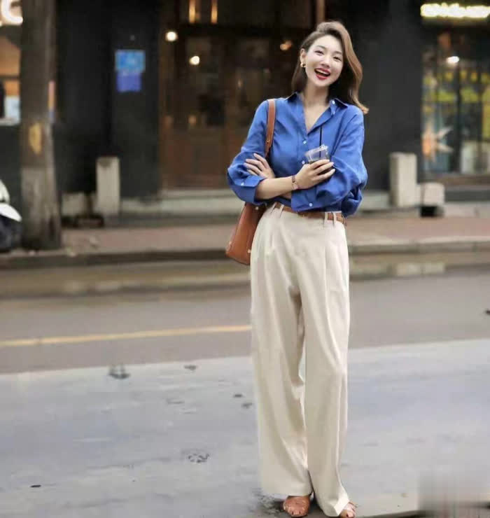 到了深秋,天氣確實轉涼,這時候我們可以用襯衫來搭配上長褲,例如下面這位博主用一件藍色的襯衫上衣,搭配上一條卡其色的西裝直筒褲,穿的時候還把襯衫上衣的衣角塞進褲子里面,帶上一款腰帶,輕松提升腰線,最主要的是下面這一條褲子面料柔軟舒適,穿在身上之后有一種垂墜感,展現出來的時尚效果顯得慵懶隨性,非常適合日常穿搭。