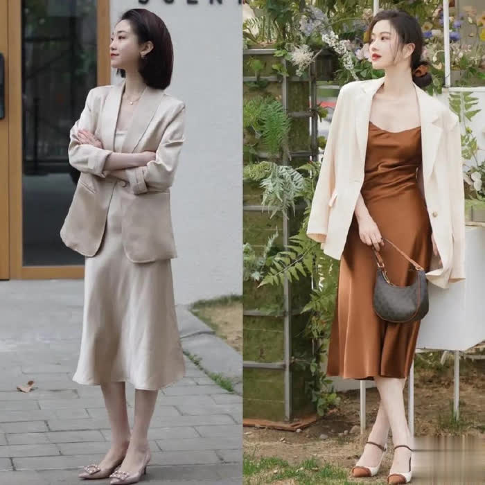 我們在選擇面料的時候多選那種免燙的裙子,或者是真絲面料,比如下面這種緞綢面料的連衣裙,真絲面料的連衣裙作為內搭,再加上挺括有型的西服外套和一雙淺口的高跟單鞋,輕松的展現出女神的氣質范,而且顯得還很高貴。
