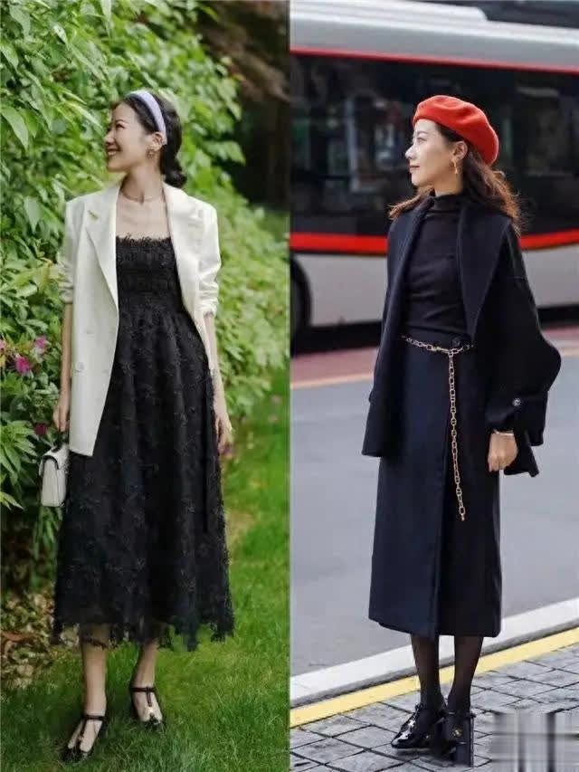 如果日常穿搭喜歡穿半身裙的你,我們可以直接選擇黑色的大衣外套內搭,黑色的打底衫加上藏藍色的直筒半身裙,腳上穿的一雙粗跟的淺口單鞋就夠。