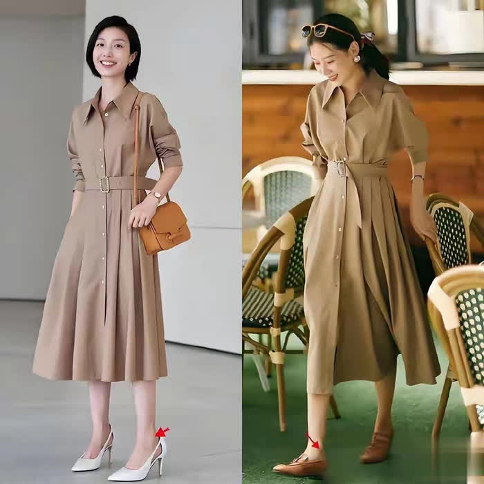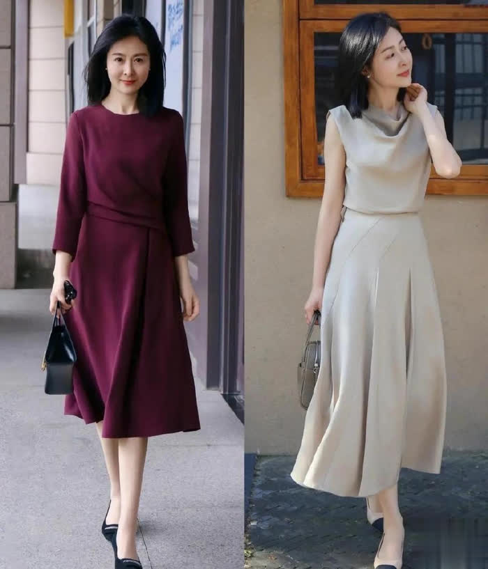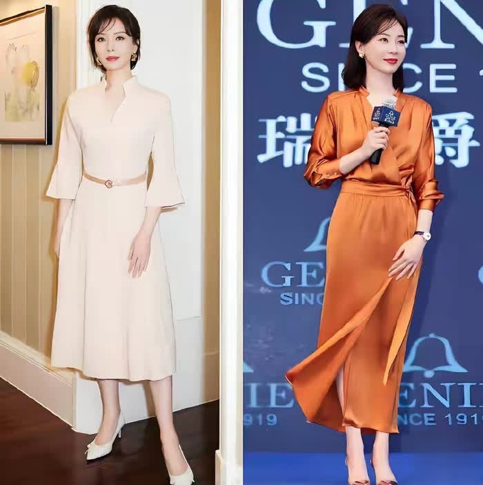接著咱們再來看一下女明星陳數的穿搭技巧,選擇一件杏色的襯衫連衣裙,搭配上白色的淺口高跟單鞋,給人的感覺就很大方,也可以選擇棕色的襯衫搭配同色系的半身裙,這樣的穿衣打扮就非常符合奔四奔五的中年女,看起來會更減齡更大氣。