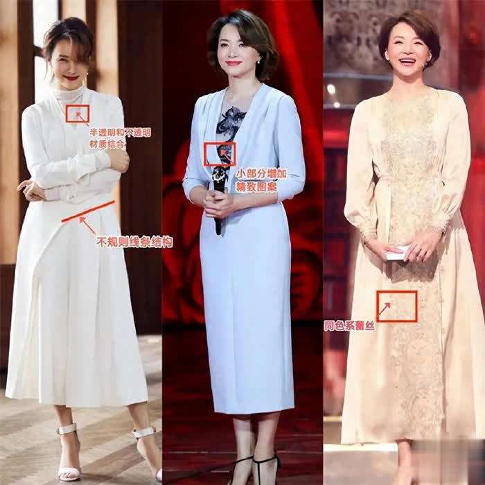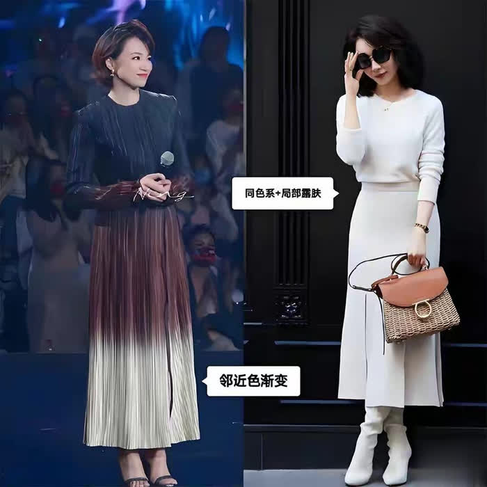 還可以選擇漸變色的連衣裙,例如下面這位著名主持人董卿的穿搭,用的就是一條漸變色的連衣裙,還是三個色調,看起來就更個性了,而且沒有任何違和感,也不會顯得很花哨,在搭配上齊肩短發,還有一雙黑色的高跟涼鞋,就能把她的氣質和高貴感呈現出來,變得更加的迷人好看。