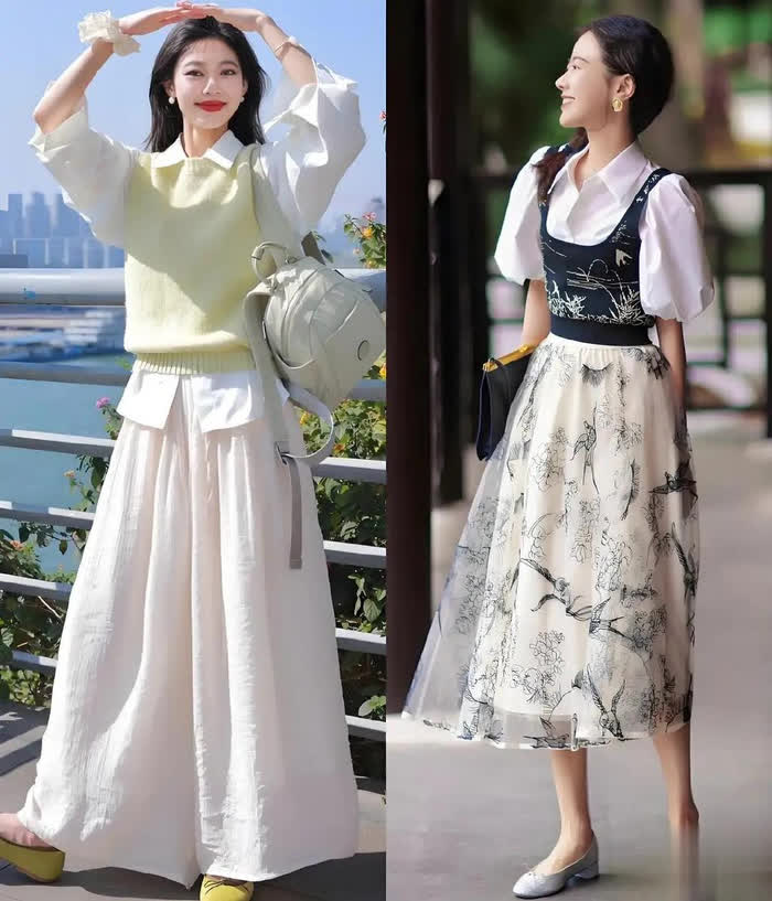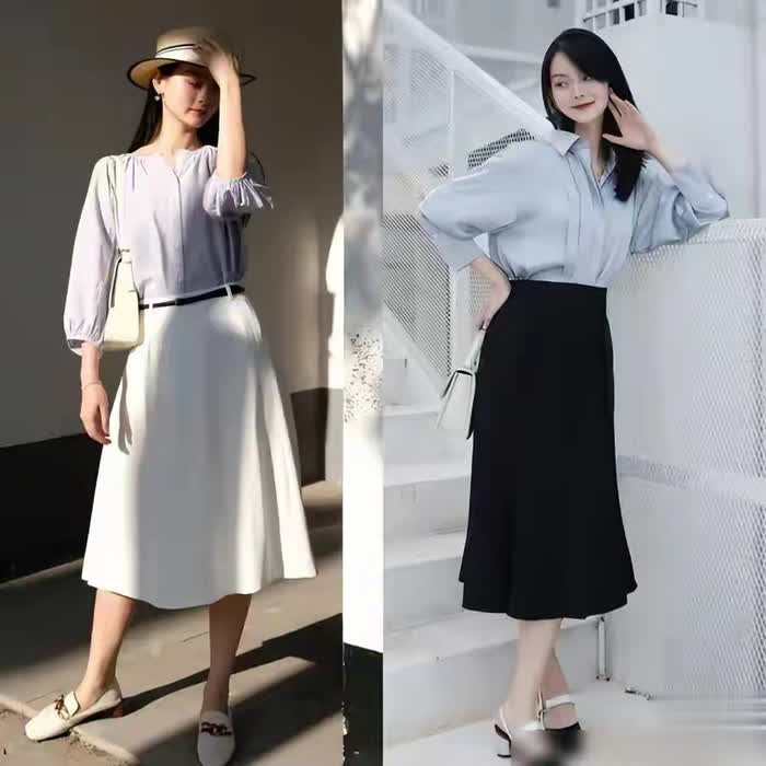 我們還可以選擇天生,就擁有時尚元素,或者是比較修飾膚色的襯衫上衣,列如,下面淺紫色的立領襯衫和淺藍色的襯衫,搭配上黑白兩條經典色調的半身裙,這樣的穿衣配色,誰能不愛?