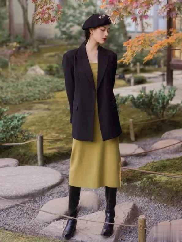 你會覺得去上班,我們想要展現自己的氣場,提升自己的氣質,這時候我們可以選擇西服外套內搭一條連衣裙,腳上穿著一雙黑色的中筒靴,頭上戴著一頂貝雷帽,這樣的穿衣打扮不光很干練,而且還非常的個性,讓你變得又颯又美。