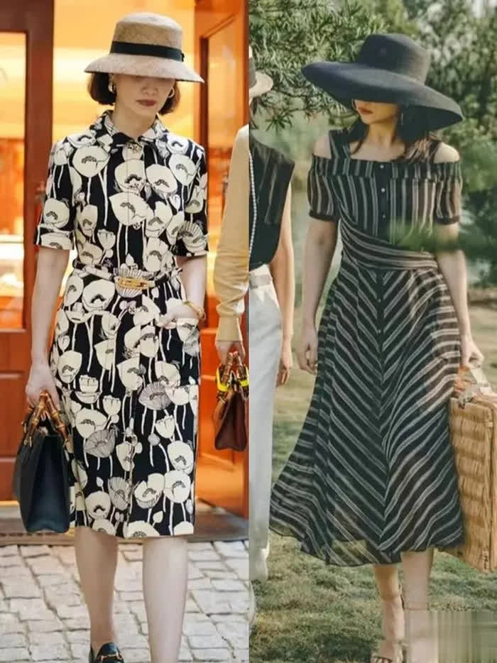 如果年齡在四五十歲,應該怎么選呢?我們可以選擇下面這種黑白印花的襯衫,連衣裙搭配上一款黑色的樂福鞋,頭上帶了一頂大眼帽就夠了,簡簡單單,反而會更好看。
