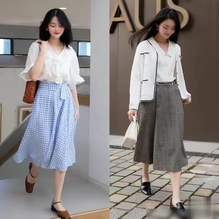當然啦,如果你覺得自己的創意打扮過于單調的情況下,還可以選擇格紋的半身裙的搭配,例如下面這兩條細格紋半身裙和粗格紋的半身裙來搭配上襯衫上衣,還有小香風外套,展現出來的效果就很精致。