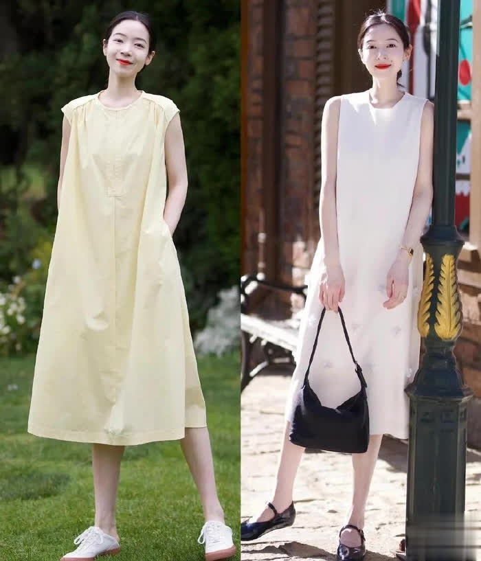 同時選擇衣服顏色的時候多選純色系,不要過于花哨,例如下面這種淺黃色的無袖連衣裙,搭配上一雙白色的休閑單鞋或者是白色的無袖連衣裙,搭配上黑色的淺口平底單鞋,這樣的搭配修飾膚色顯白顯嫩,而且還能降低我們的穿衣打扮出錯率。