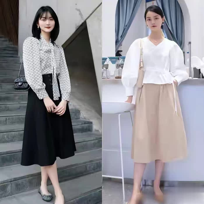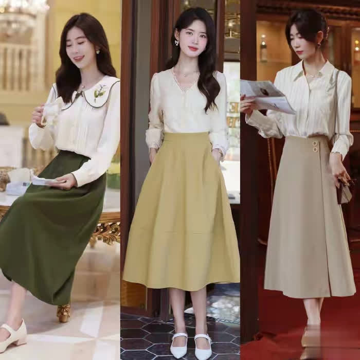 不過在選擇半身裙的時候,一定要注意裙子長度,蓋過膝蓋到小腿肚的位置最佳,適當的露出肌膚,能夠延伸腿部線條,例如下面用一件白色的燈籠袖襯衫搭配上卡其色的半身裙,這樣的穿衣打扮經典耐看,不挑人不挑膚色,誰穿誰好看。