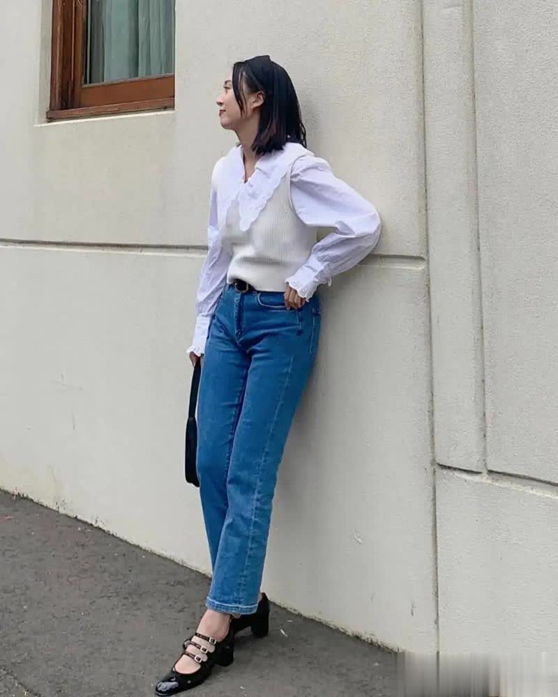 淺口鞋很小巧精致,用比較寬松的下裝去和它做對(duì)比,會(huì)顯得你的腳步特別纖瘦。我們可以選擇比較寬松的直筒褲、西裝褲、牛仔褲或者各類過(guò)膝裙等,都可以打造這種高挑纖細(xì)的效果。