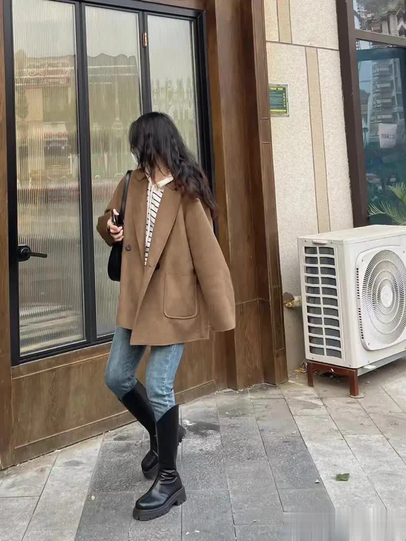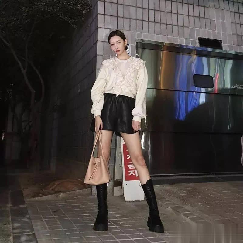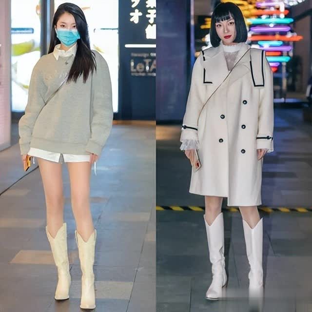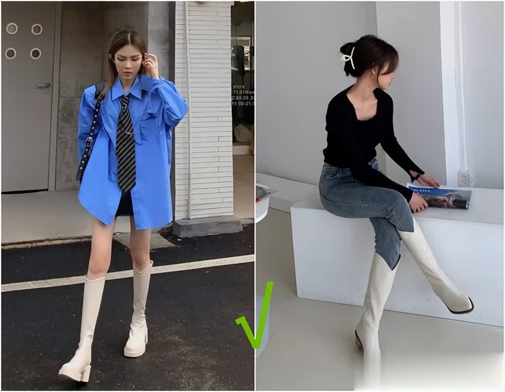 這種靴子的高度在膝蓋附近,不要選擇和這個(gè)高度剛好卡著的下裝,最容易顯矮!要么選擇膝蓋以上的短裙、短褲等與之搭配,要么直接選擇蓋過(guò)膝蓋的修身褲子等,將靴子直接套在褲子之上,能打造近似光腿狀態(tài)時(shí)的穿搭效果,一樣很出眾,顯高挑。
