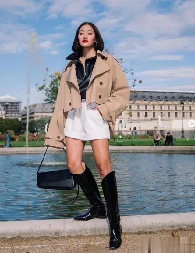 無(wú)論你穿褲子還是裙子,長(zhǎng)度是長(zhǎng)還是短,都要窄于騎士靴,才不會(huì)形成很難看的堆積感,一旦堆疊,就會(huì)顯矮。